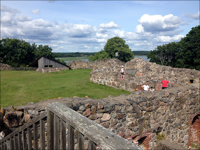 Ruissalosta sitten kurvattiin pois ja lähdettiin takasinpäin, mutta pysähdyttiin Kaarinassa ja mentiin tsekkaamaan Kuusiston linnanrauniot. Päivä oli hieno kesäpäivä, ja ihmiset oli liikkeellä, niin myöskin Kuusistossa. Itse rauniot oli kyllä hienon näköiset, mutta eivät sopineet ollenkaan tällaselle korkeanpaikankammoiselle. Akke taas tuntui olevan kuin kotonaan siellä kiviseinien päällä kiipeillessään. En siis varmaan saanut siitä irti kaikkea mitä olis voinut, koska en uskaltanut kiipeillä. Ihmisiä siellä oli tosiaan ottamassa aurinkoa, piknikillä ja jotain teinejä ottamassa toisistaan valokuvia, vilinää oli, joten en oikein viihtynyt :P Rauhallisempana päivänä ois varmasti ollut mukavampi.